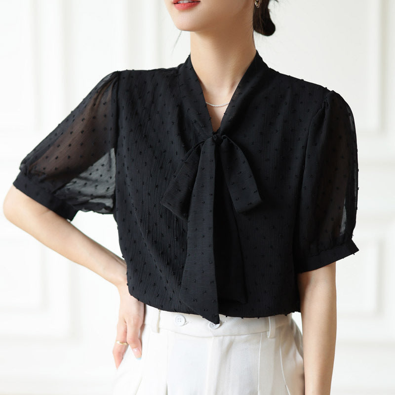 Bow Lace-up Polka Dots Short Sleeve Top