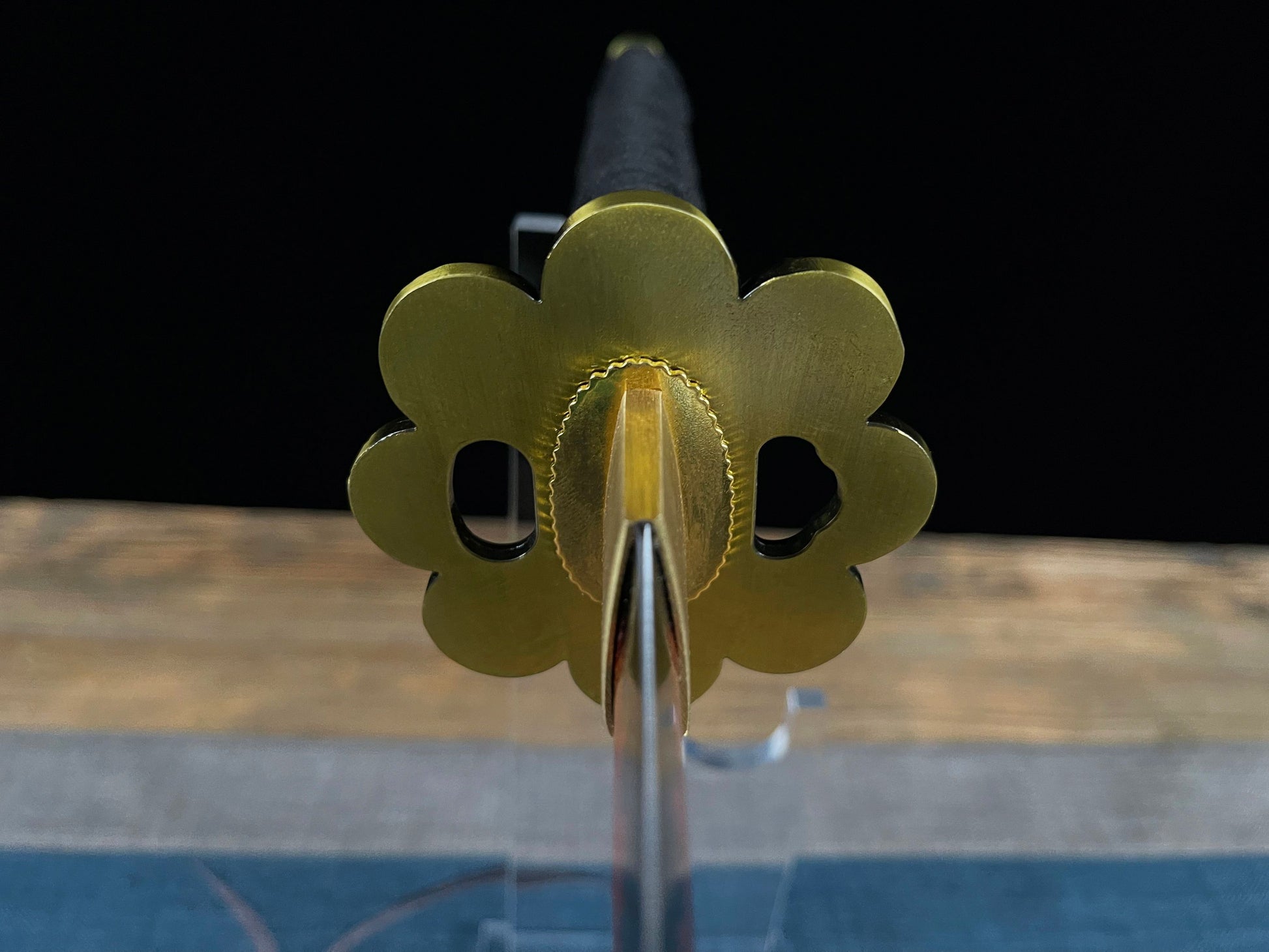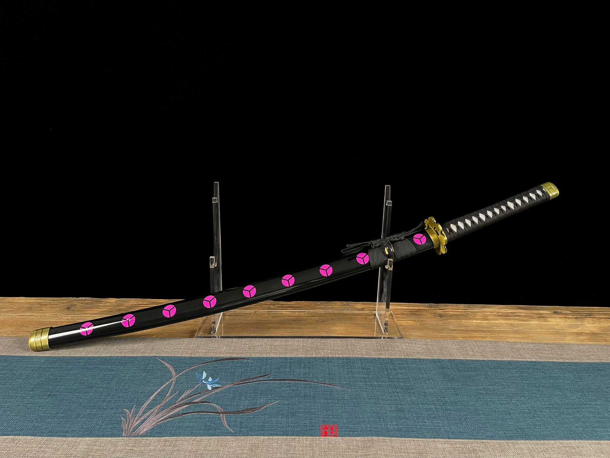 For functionality and elegance, the sheath is crafted from hardwood and finished in a glossy black lacquer with intricate patterns that provide a touch of sophistication. The handle, also made from hardwood, features a black ribbon intertwined with imitation white fish skin for optimal grip and comfort. This not only ensures a secure hold during use but also adds a luxurious texture to the overall feel of the sword.