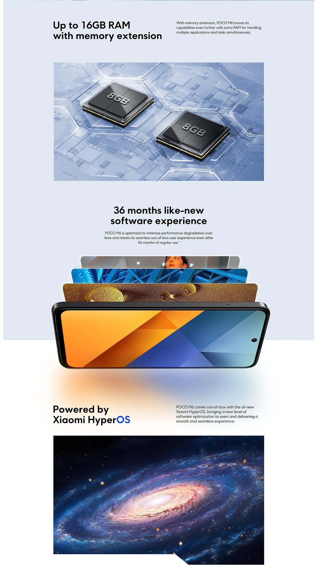 POCO M6 is optimized to minimize performance degradation over time and retains its seamless out-of-box user experience even after 36 months of regular use.*