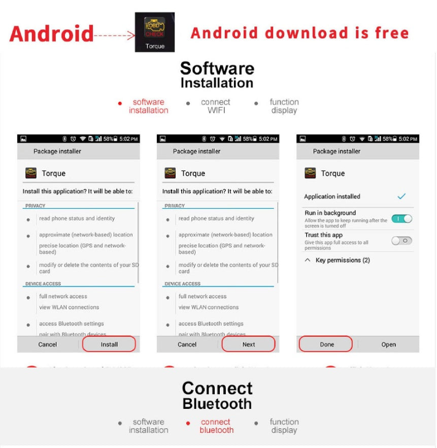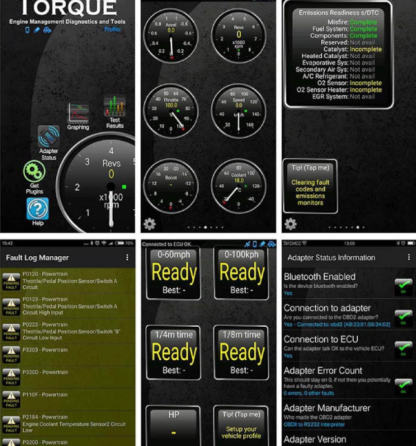 • Read diagnostic trouble codes, both generic and manufacturer-specific, and display their meaning (over 3000 generic code definitions in the database).