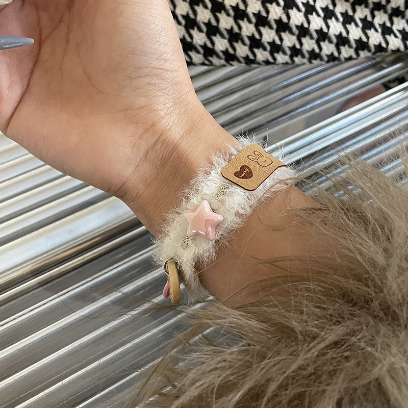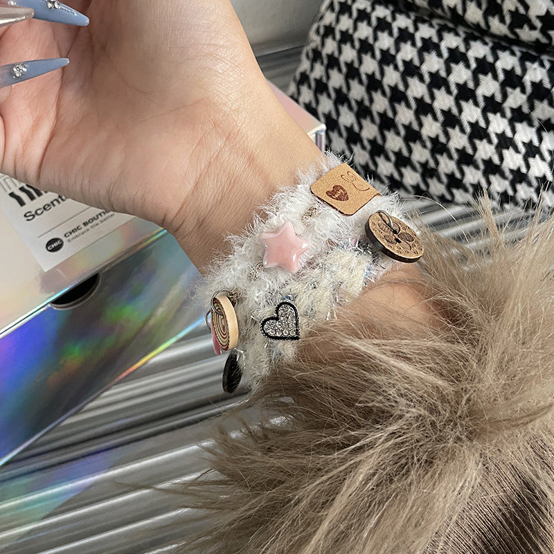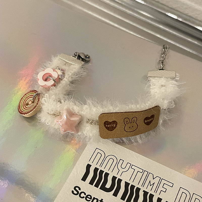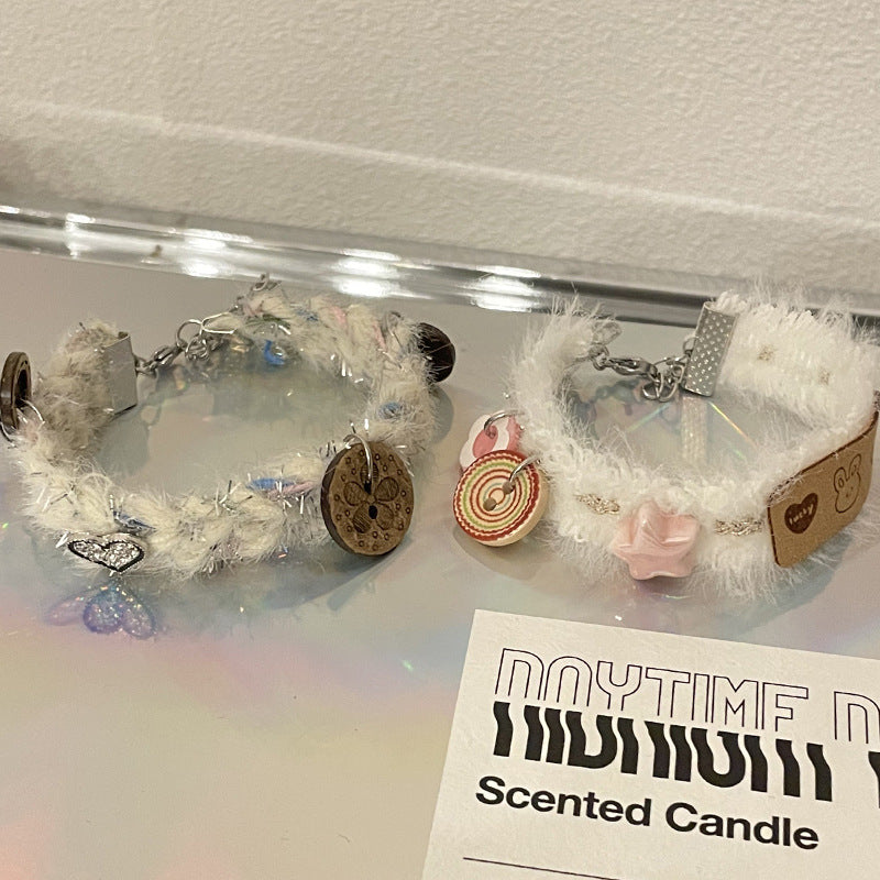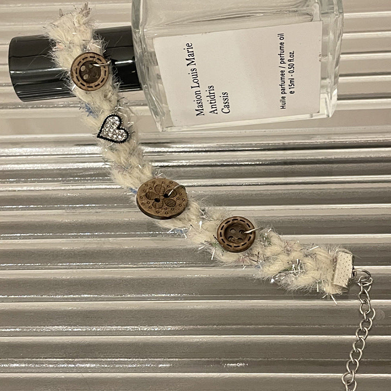 The bracelet features a stunning combination of pink XINGX buttons, heart shapes, and five-pointed stars, seamlessly stitched together with mixed materials. Its vibrant color and playful design make it an eye-catching addition to any outfit, whether it’s casual or dressy. This piece embodies the trendy styles from Japan and South Korea, reflecting the latest fashion inspirations for contemporary women.