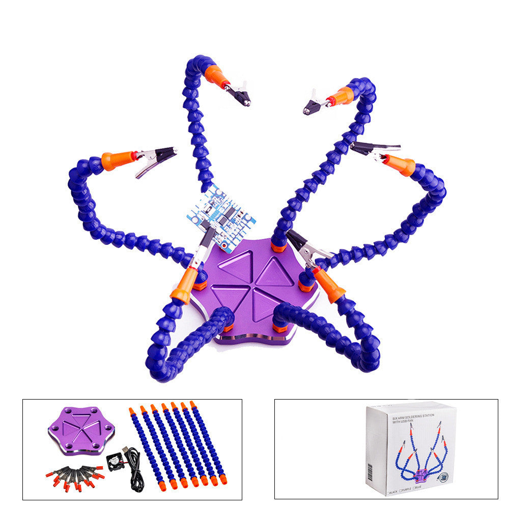 The bottom layer is non-slip, and the soldering station is aluminum, so it won't slip. Multi-function tool table, 6-arm multi-purpose, suitable for model aircraft plugs, flight control of flying aircraft, etc., can help you complete various complex welding. At the same time, the large piece of all-metal used in the bottom plate, only the bracket can be bent arbitrarily, which can be easily Clamp up any object waiting to be welded, the head chuck can also be rotated 360 degrees at will, and the internal groove can accommodate various screws and materials required for welding.