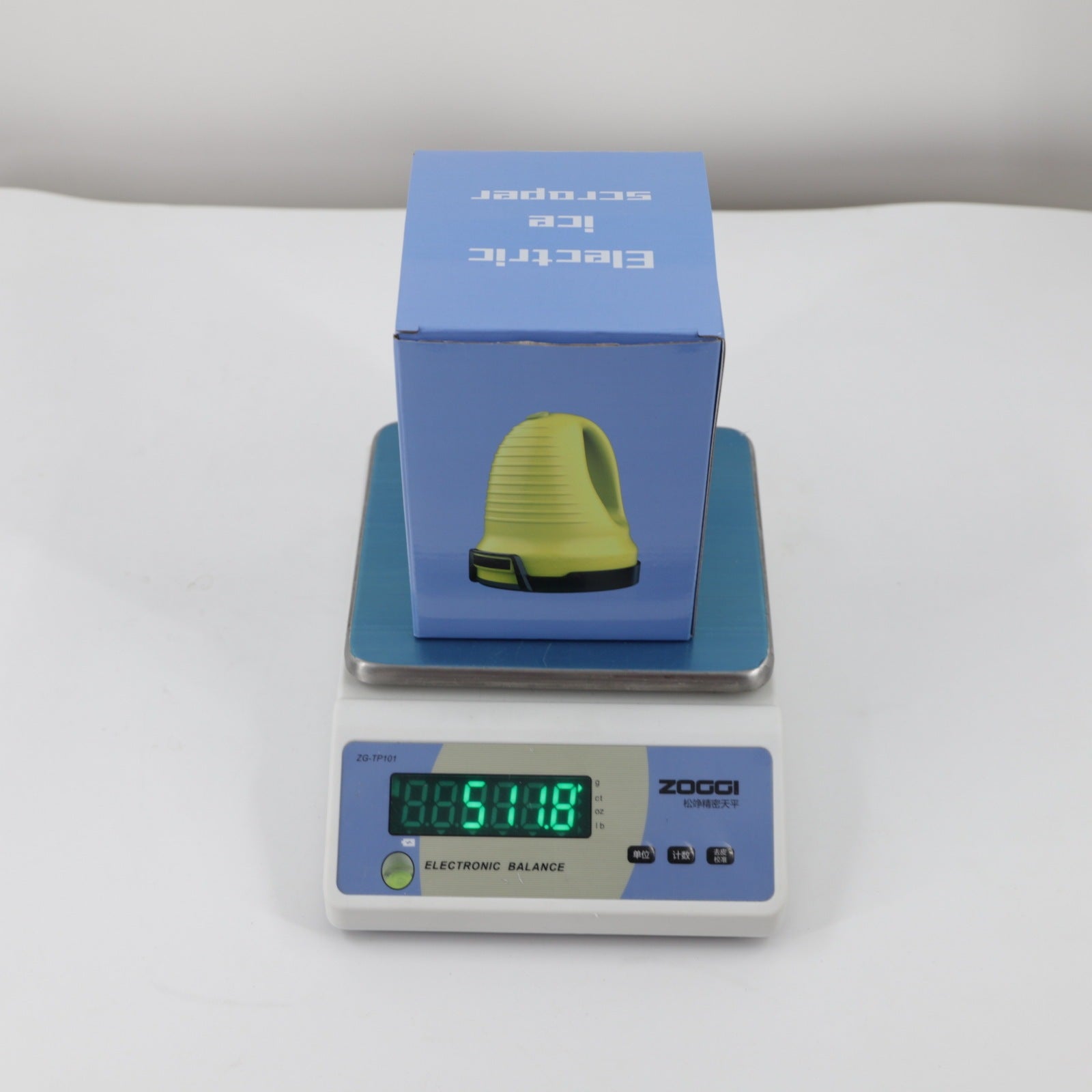 Box contents: Electric window scraper with protective cap and rotating removal disc, USB charger.