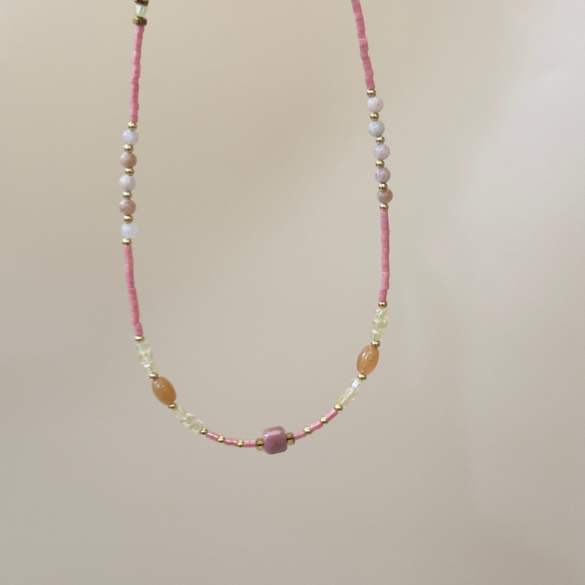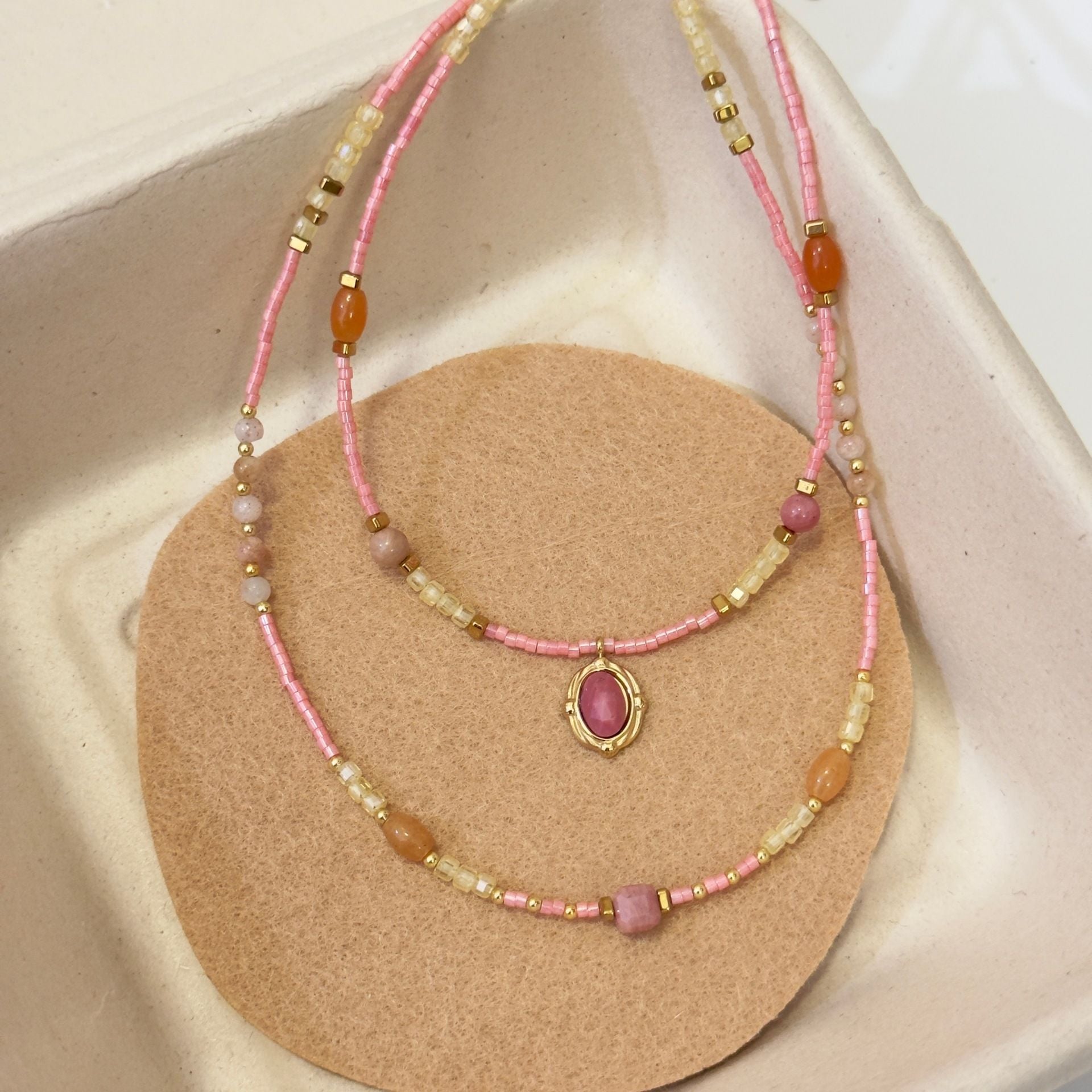The necklace showcases a delightful blend of natural rose stone beads, creating a harmonious color palette that radiates sweetness and sophistication. Its geometric shape, enhanced by a captivating pink pendant, gives it a modern twist while embracing classic elements. The design includes a chic circle motif that is currently trending in fashion, allowing you to express your stylish personality effortlessly.