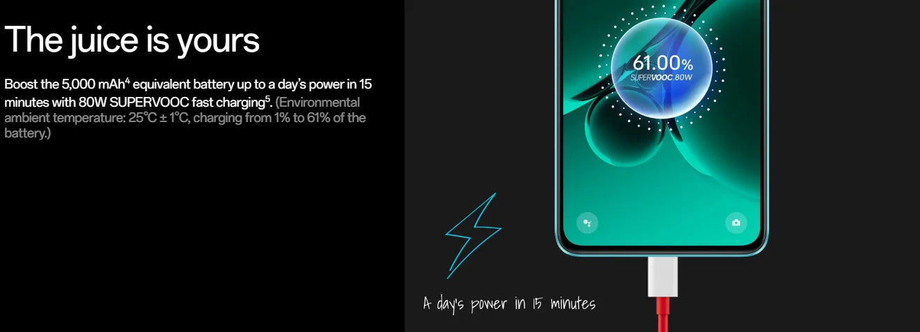 Battery: 5,000mAh (Dual-cell 2,500 mAh, non-removable), 80W SUPERVOOC.