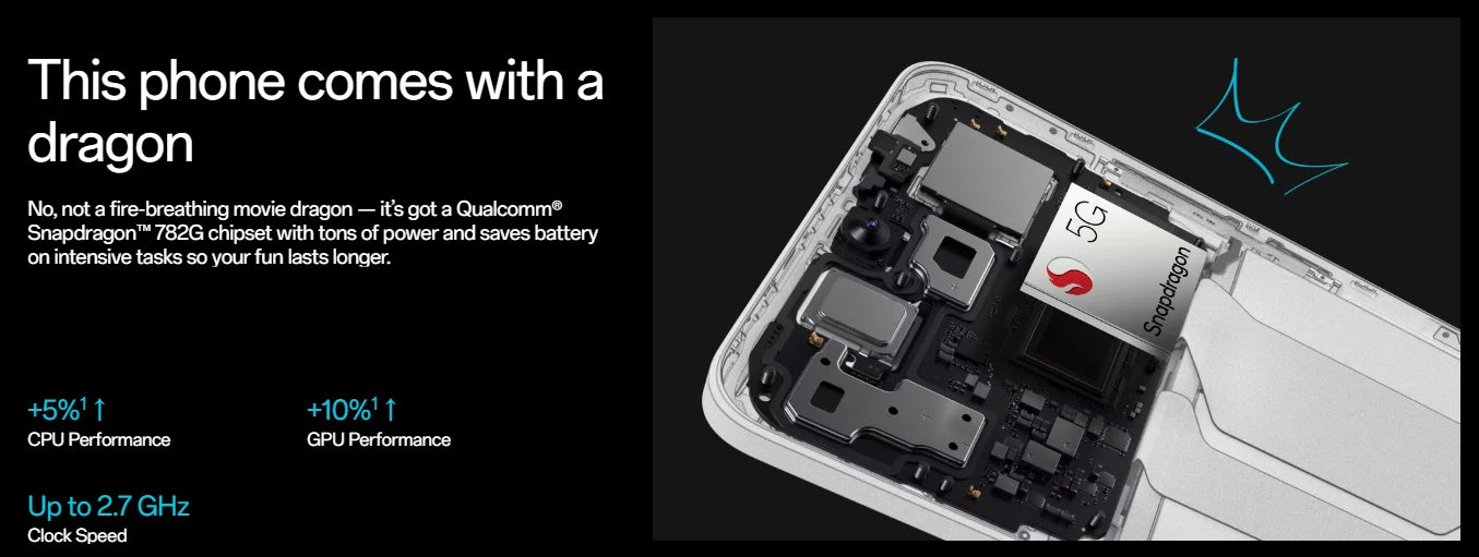 No, not a fire-breathing movie dragon — it’s got a Qualcomm Snapdragon 782G chipset with tons of power and saves battery on intensive tasks so your fun lasts longer.