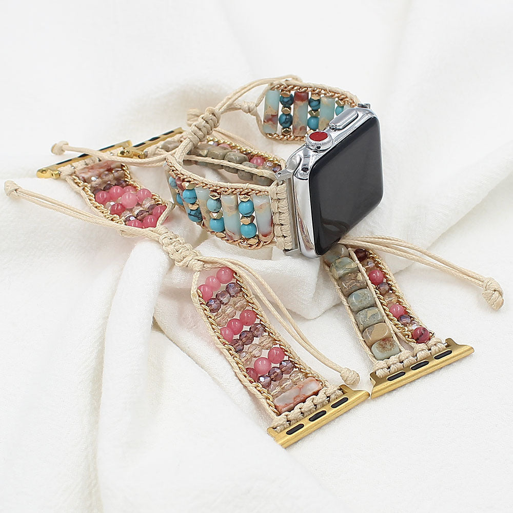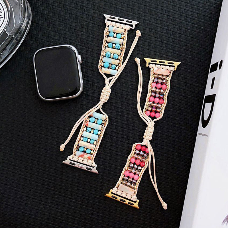 This fashionable watch band showcases a variety of vibrant colors, including pink and blue. These hues not only enhance your personal style but also make your smartwatch stand out. The strap is available in multiple specifications, catering to different Apple watch sizes: 38/40/41mm and 42/44/45/49mm. Designed with premium stone material, the construction ensures durability without compromising on comfort.