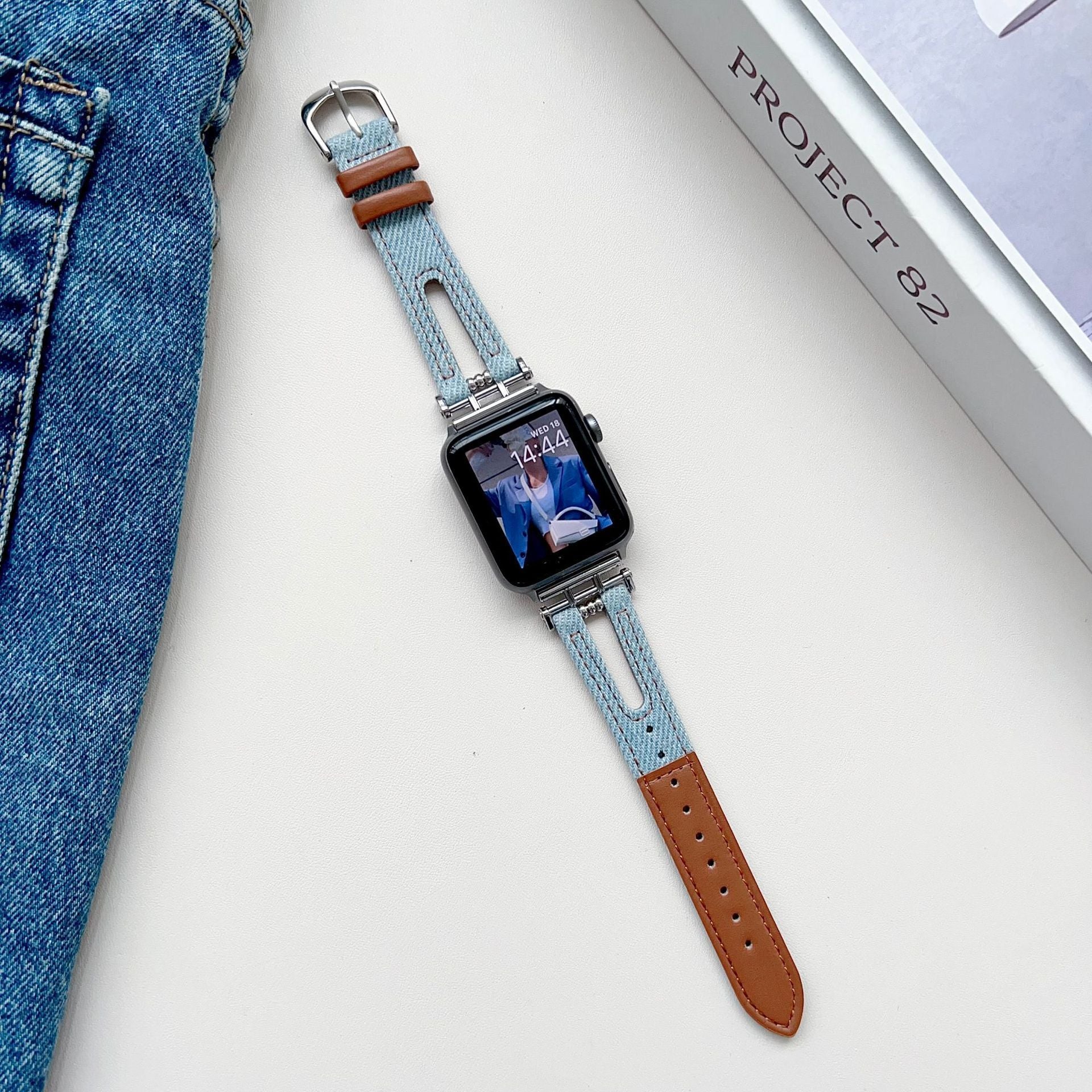 This stylish smartwatch is designed for Apple models, ensuring compatibility and ease of use for Apple enthusiasts. Built with high-quality denim leather, the watch features a durable metal buckle that adds to its longevity and stylish appearance. The meticulous stitching not only enhances its aesthetic but also provides extra strength.