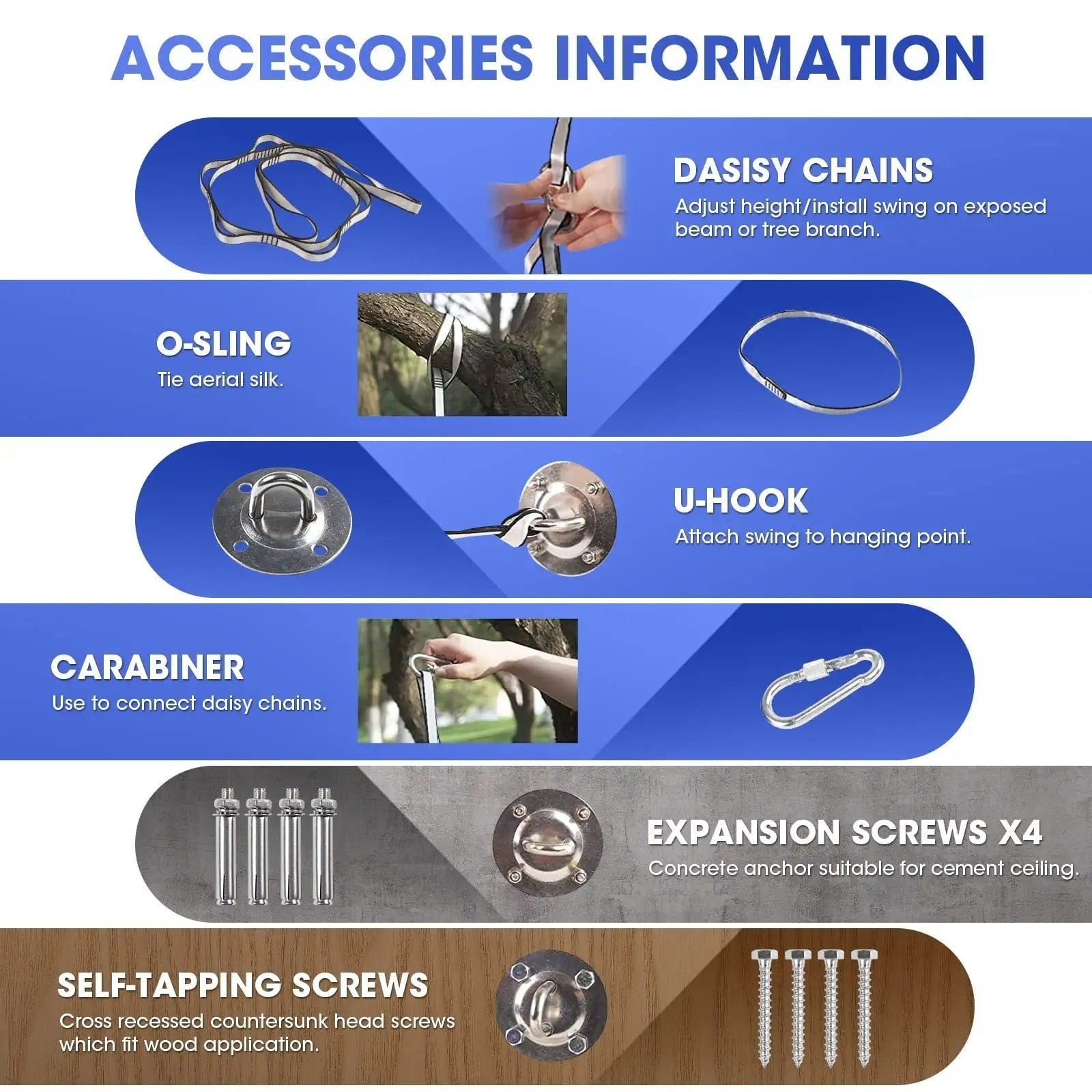 - [EASY USE]: No need to purchase extra hardware or figure out complicated pieces. This yoga swing is sent with necessary hardware. The whole swing can be set up within few minutes indoor/outdoor.The daisy chain can adjust the height easily--make hanging simple for kids.(Age: 3~10. Young children should use it under supervision and with help of adults)