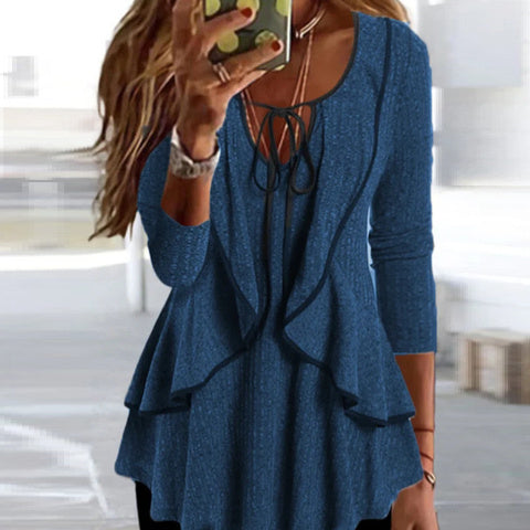 V-neck Lace-up Ruffled Temperament Commute Casual Long-sleeved Top