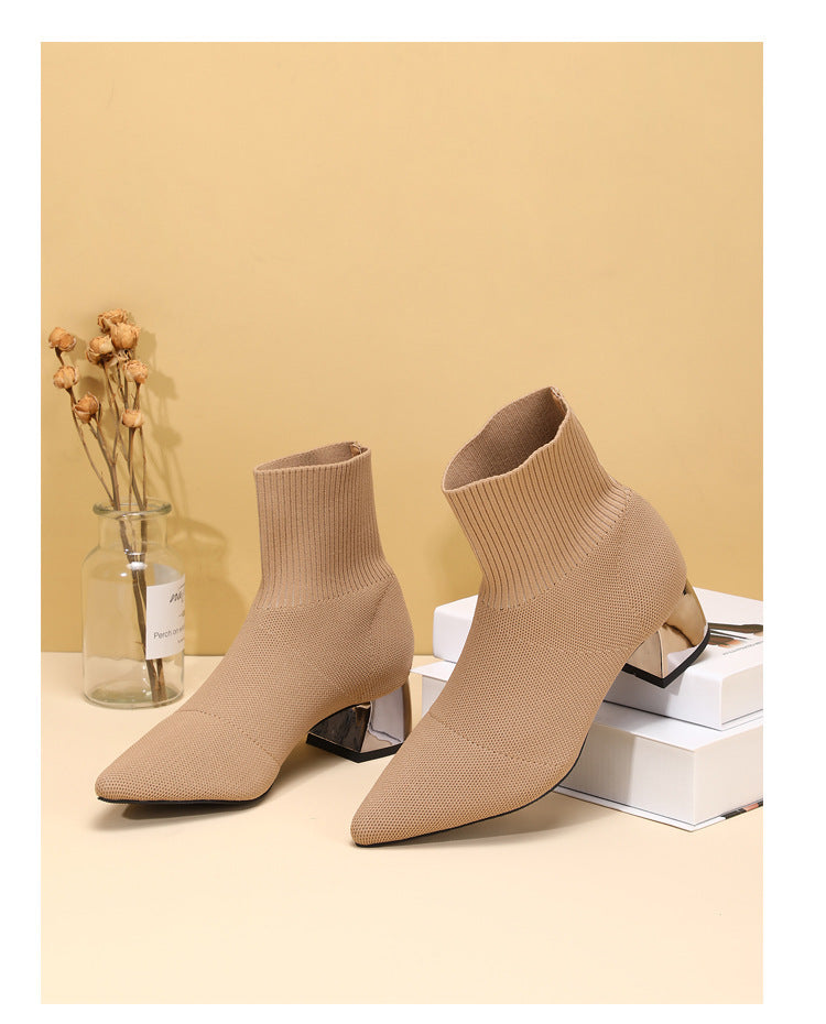 The lining material is made of breathable cloth, providing extra comfort throughout the day. With a classic tip toe bracket shape, these boots stand out with their elegant design. Available in two versatile colors, Black and Apricot, they can complement a wide range of outfits—whether you're dressing up for a night out or adding a touch of flair to your everyday look.