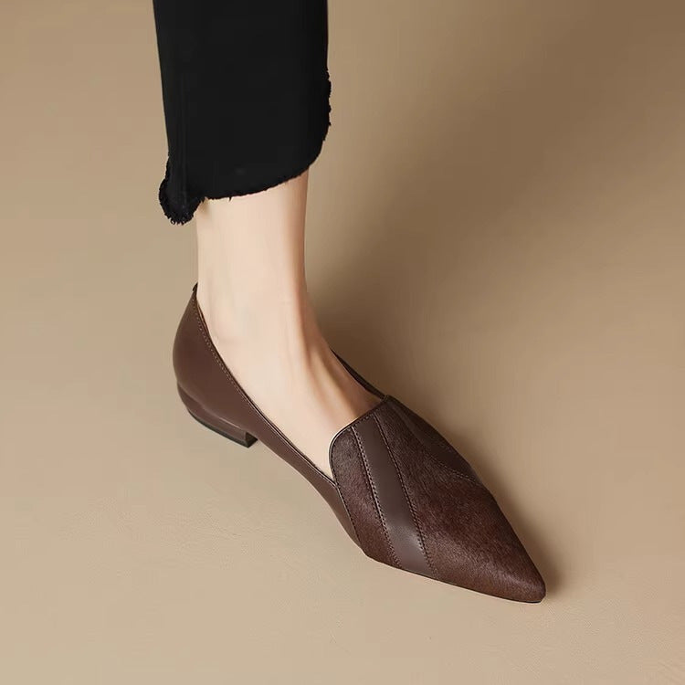 The Stitched Leather Pointed Low-Cut Shoes feature a solid color pattern, making them versatile for any wardrobe. Choose from classic shades of black, apricot, and dark brown to complement your outfits and showcase your personal style. With a low top height, these shoes provide the perfect balance of support and freedom of movement, ensuring you stay comfortable all day long.